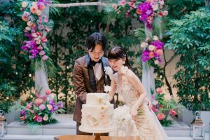 シンプルなウェディングケーキにおふたりでペイントしていただくセレモニー